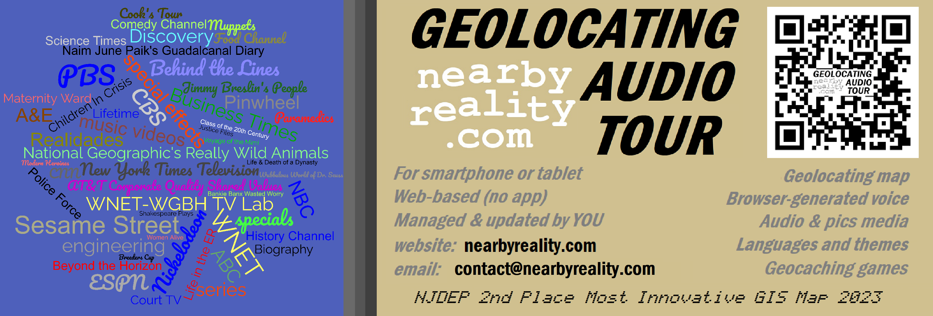 Building on experience in broadcast media, software engineering, and higher and secondary education, Phil currently focuses on developing his Geolocating Audio Tour web platform which won 2nd place as Most Innovative at NJDEP's 35th Annual GIS Map Contest in 2023. Outdoor venues anywhere in the world can subscribe (free to not-for-profits). Then their self-guiding visitors call up a web page on their smartphone to get a geolocating map and optional audio and picture messages at POIs along any route walked by the visitor. There's also a geocaching game that includes simulated radio tracking. Venue staff self-manage their Audio Tour text-to-browser-speech scripts, themes and other multimedia content. See https://nearbyreality.com for details and demo.